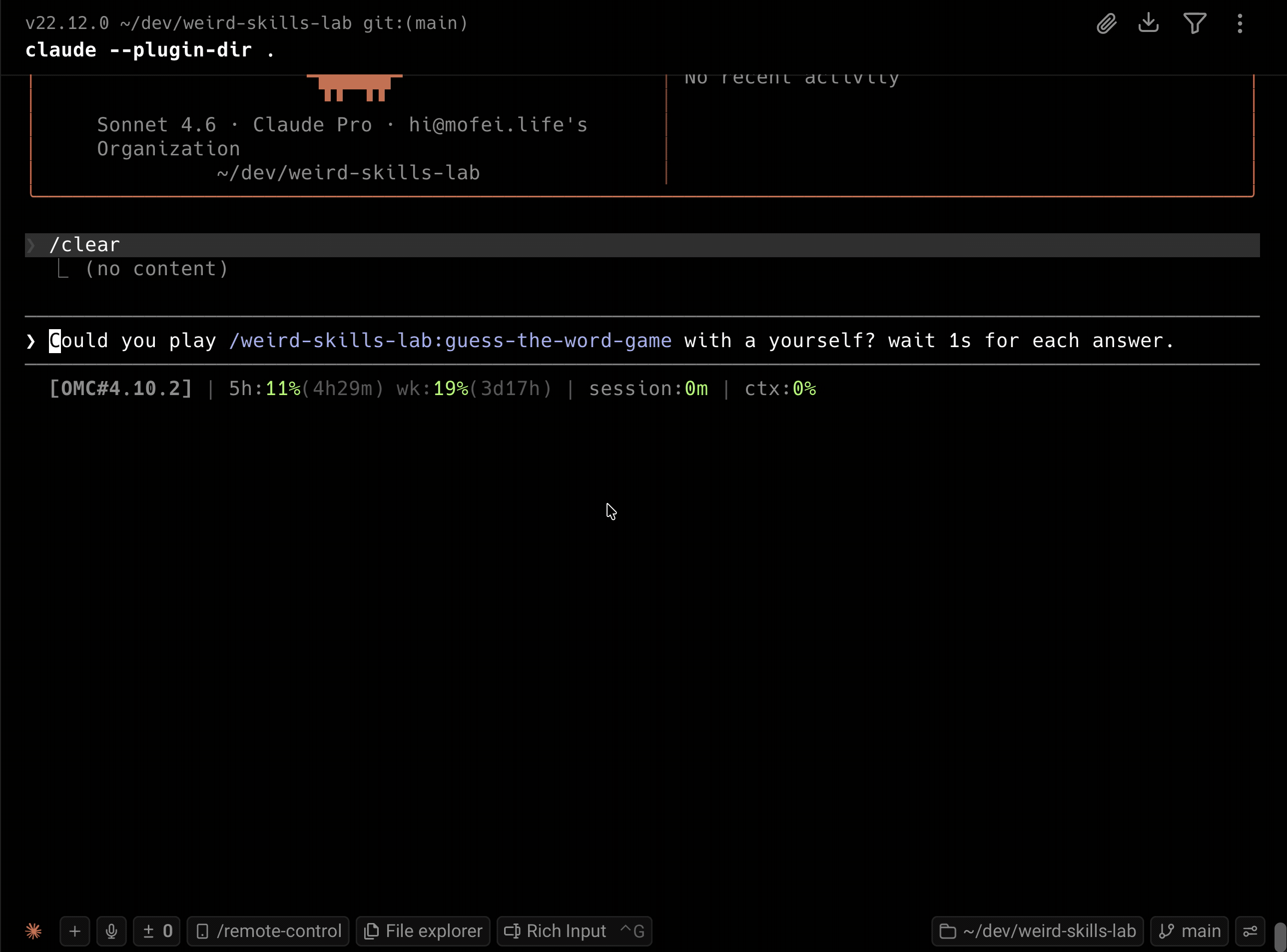 So what I made in the end was an AI skill called guess-the-word-game. I even opened a separate repo for this kind of thing, called weird-skills-lab. The name fits well. It is a place for small and slightly unserious skills that can still be played inside the terminal.