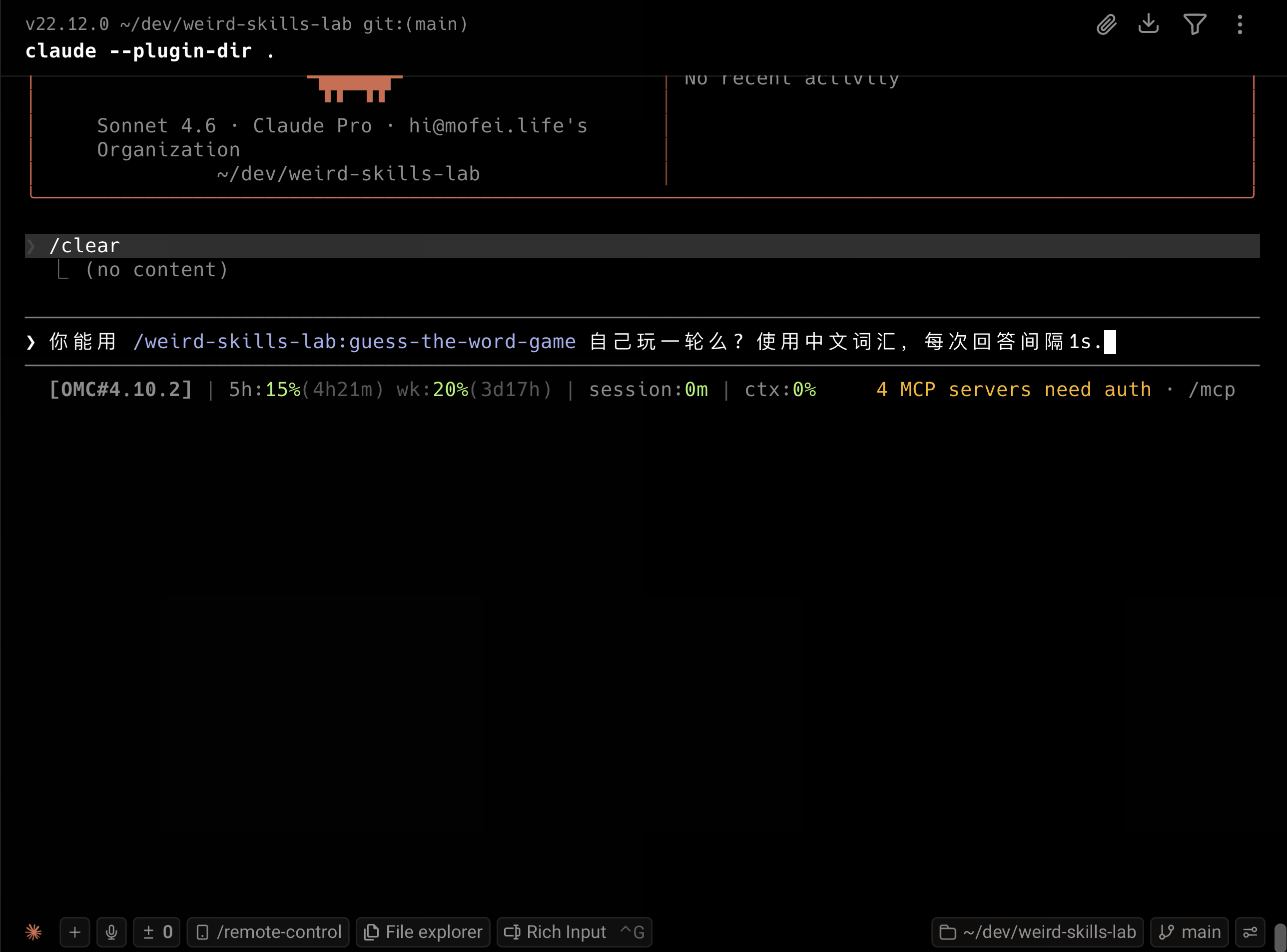 所以我最后做的是一个 AI skill,名字叫 guess-the-word-game。我还专门为这种东西开了一个仓库,叫 weird-skills-lab。这个名字很应景:就是专门收一些不太正经、但又确实可以在 terminal 里玩起来的奇怪 skill。